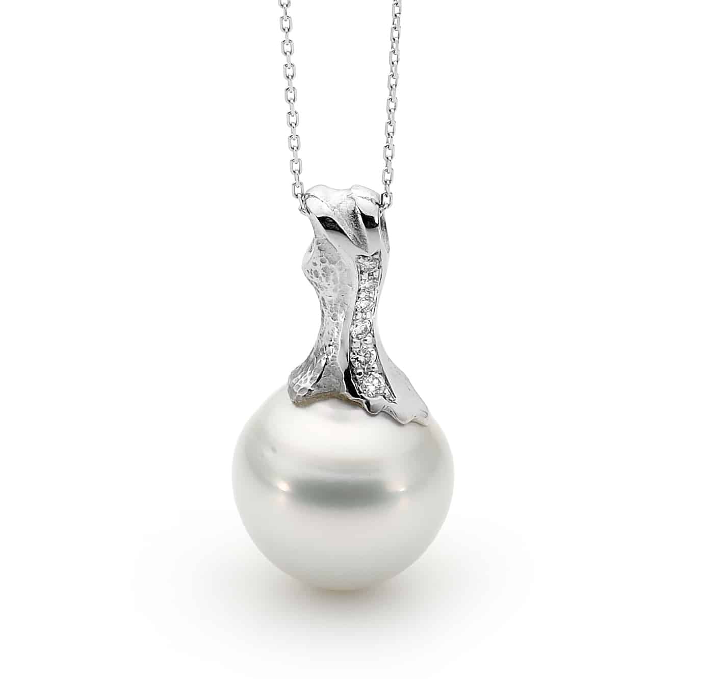 This 18ct White gold pendant has been handcrafted using the finest Australian South Sea Pearl. The freeform design moulds itself to the organic shape of the pearl and is set with Round Brilliant diamonds.