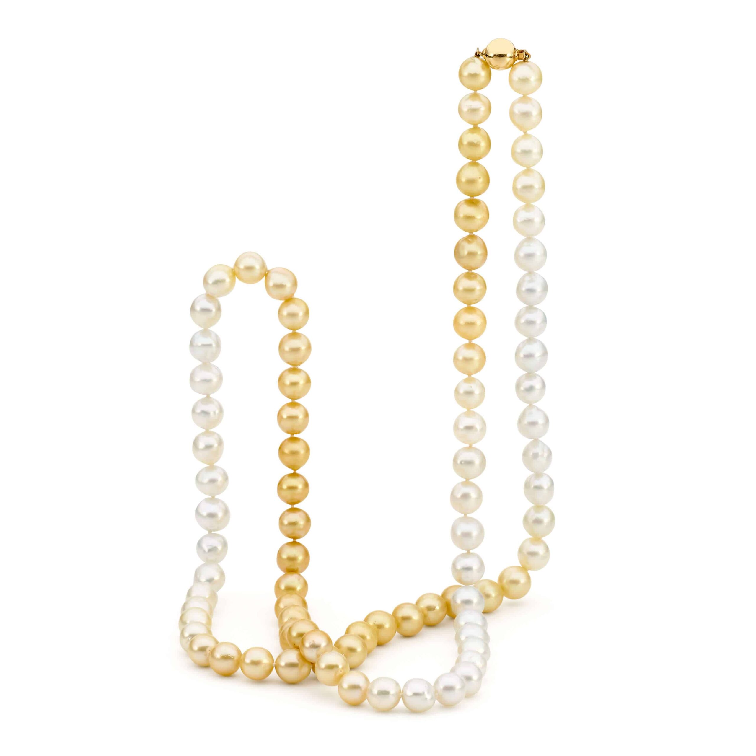 This long strand features both the Golden Pearl and the Australian South Sea Pearl. The pearls are 10 – 11mm in size. Finished by an 18ct Yellow Gold clasp.