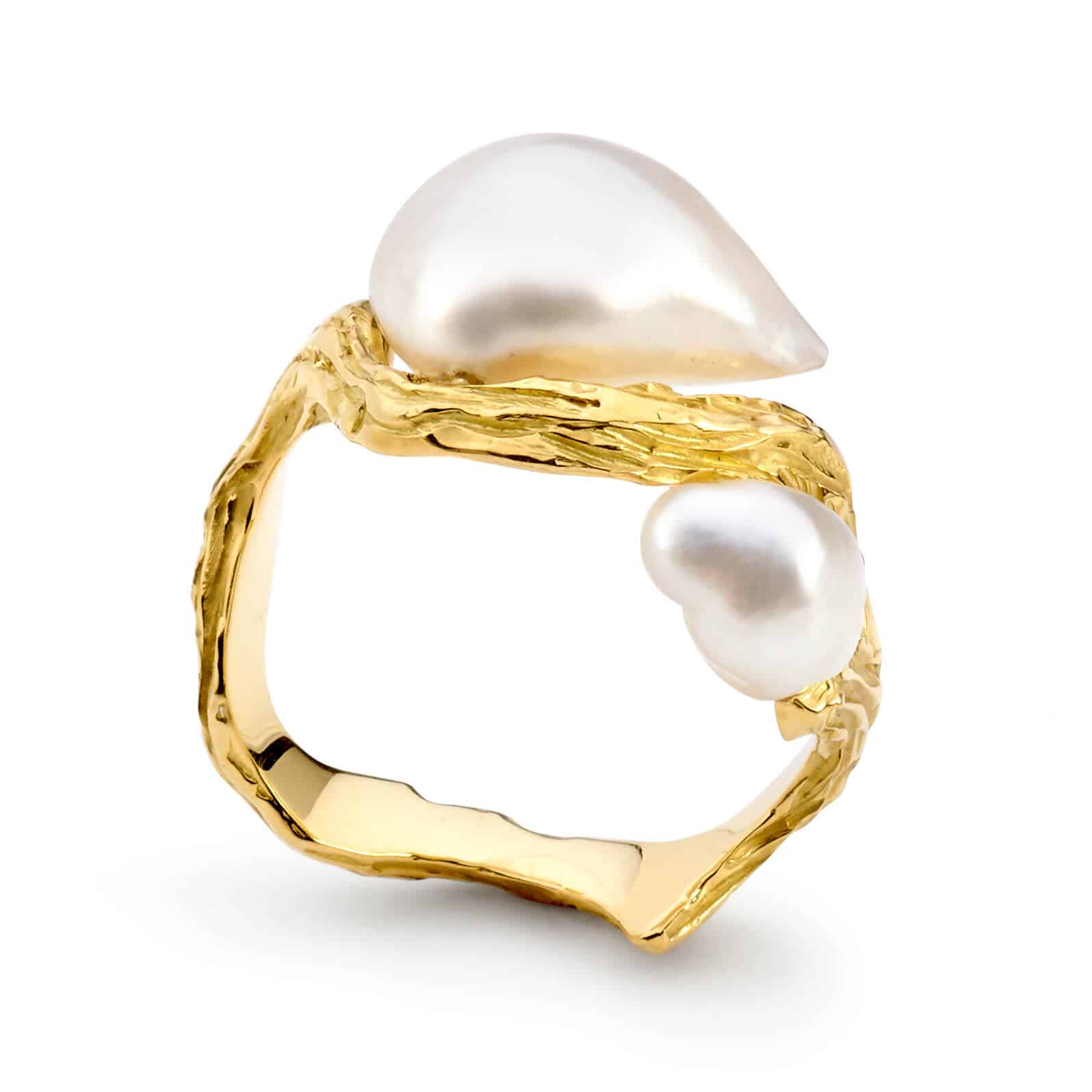 This ring has been handcrafted in 18ct Yellow Gold with a textured finish. This ring features two Freshwater pearls.