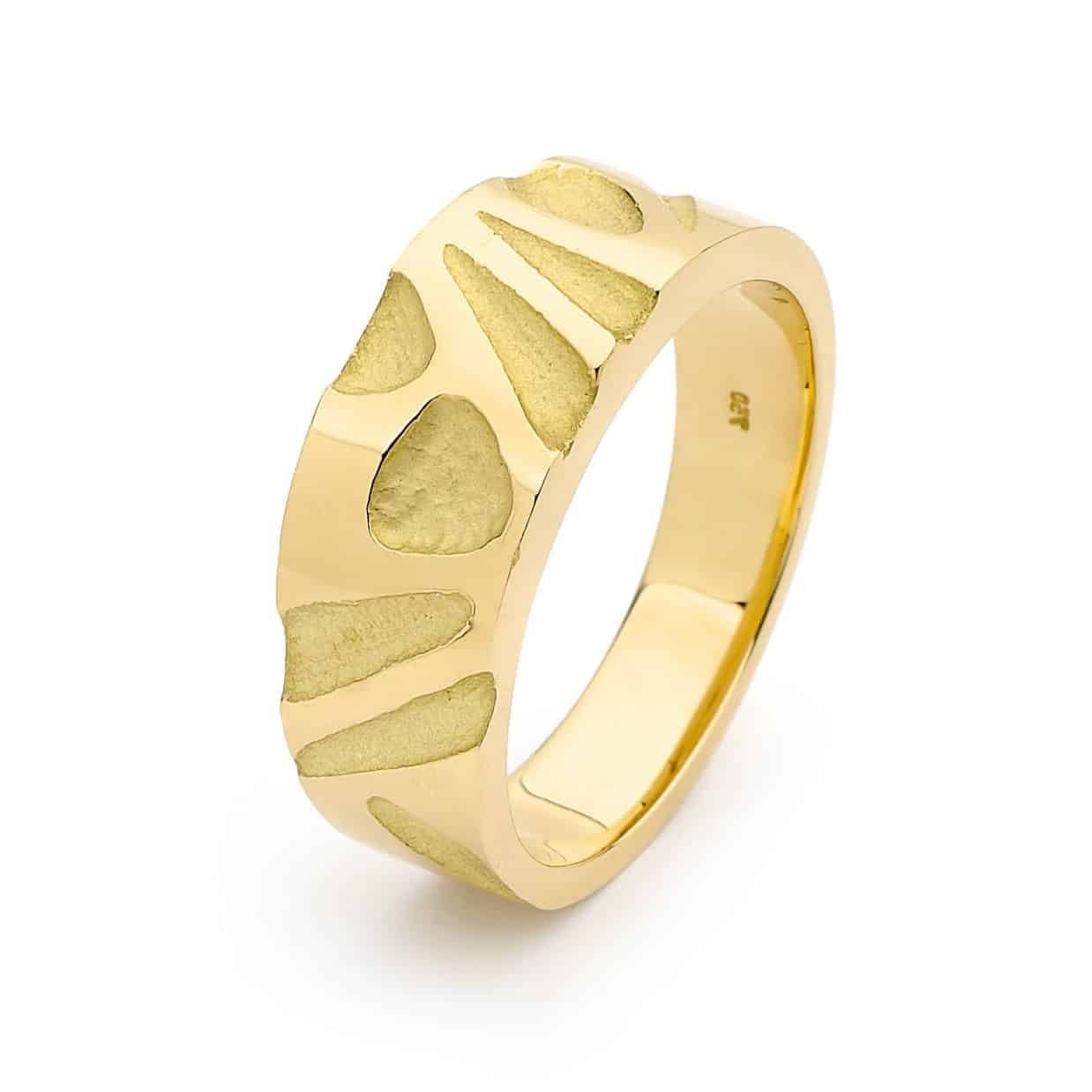 This Freeform ring has been handcrafted in 18ct Yellow Gold. Finished with an abstract pattern.