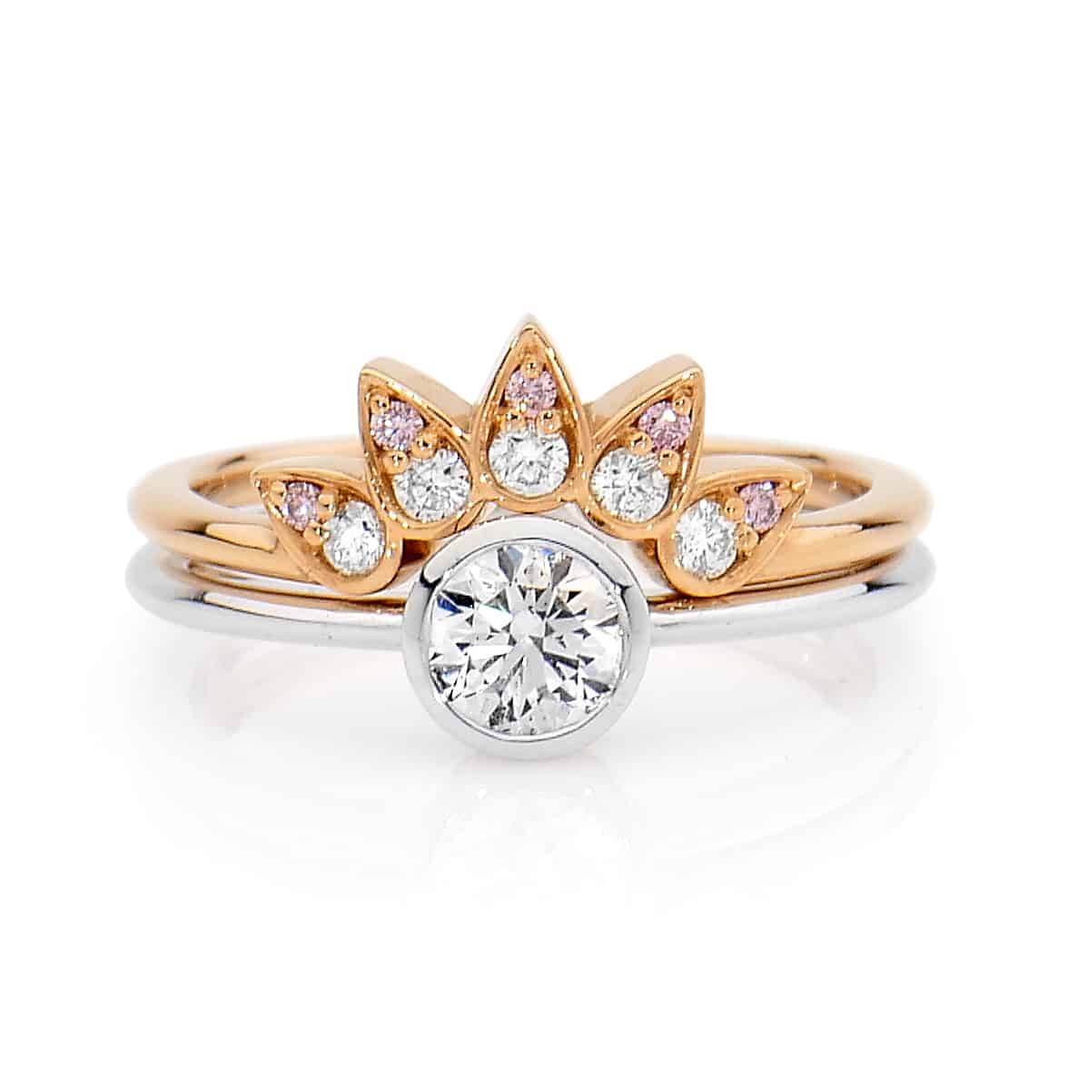 This exquisite set features an Argyle Certified White Solitaire diamond set in a bezel setting, handcrafted in 18ct White Gold. The wedding band has been designed to resemble a crown set with five Round Brilliant White diamonds and five highly sought after Pink Diamonds. The wedding band is handcrafted in 18ct Rose Gold.